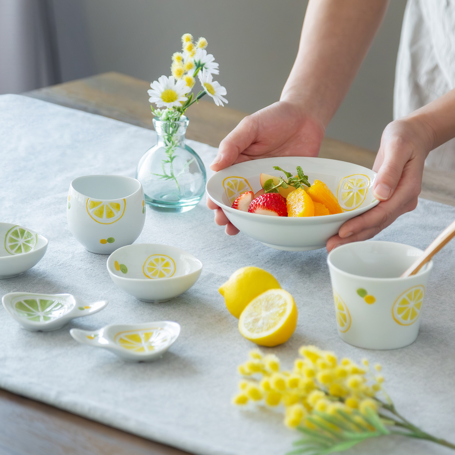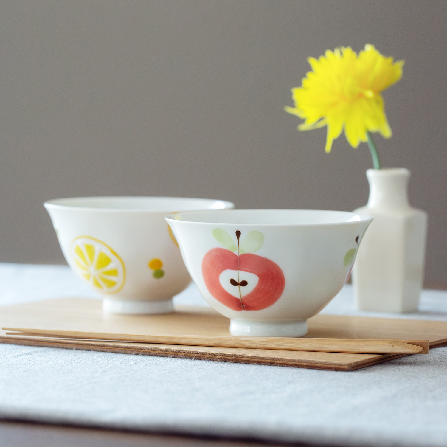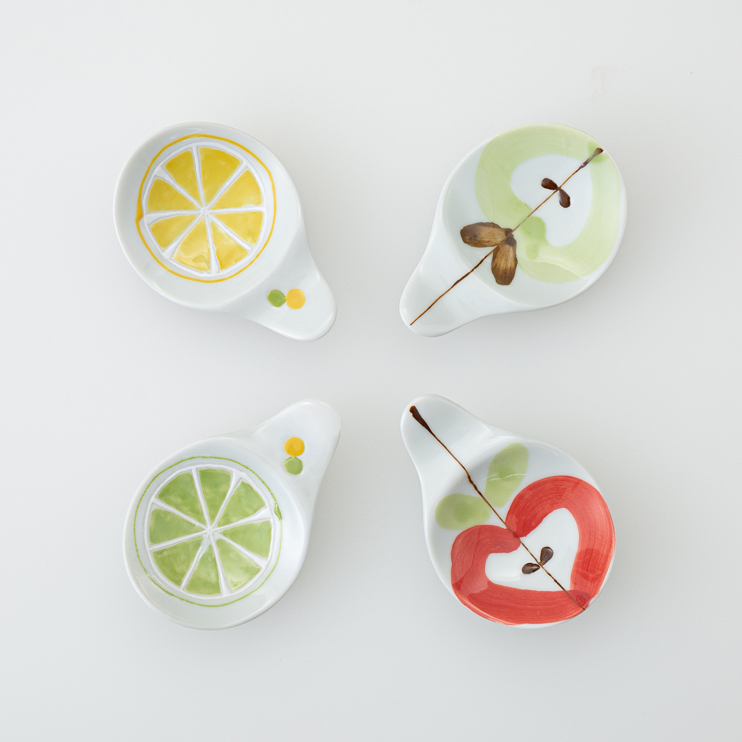 すっぱいレモンと姫りんごをイメージした、フレッシュでミニマルなフルーツうつわ。テーブルの差し色になるサイズ感。柄は手描きで仕上げているため、色や線の表情には個体差があります。